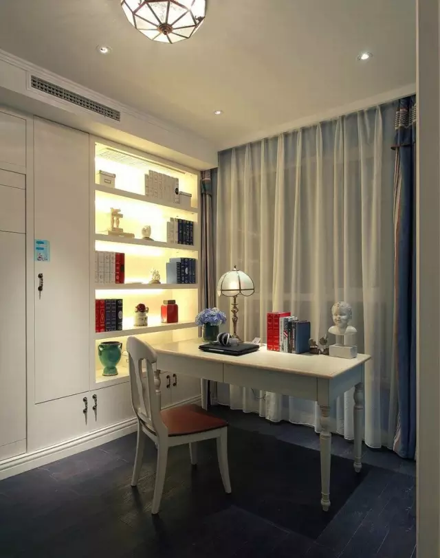 飄窗簾與純白色的家具搭配,顯得書(shū)房有某種神秘的安靜,進(jìn)到書(shū)房整個(gè)人會(huì)變得莫名其妙的心靜下來(lái)吧