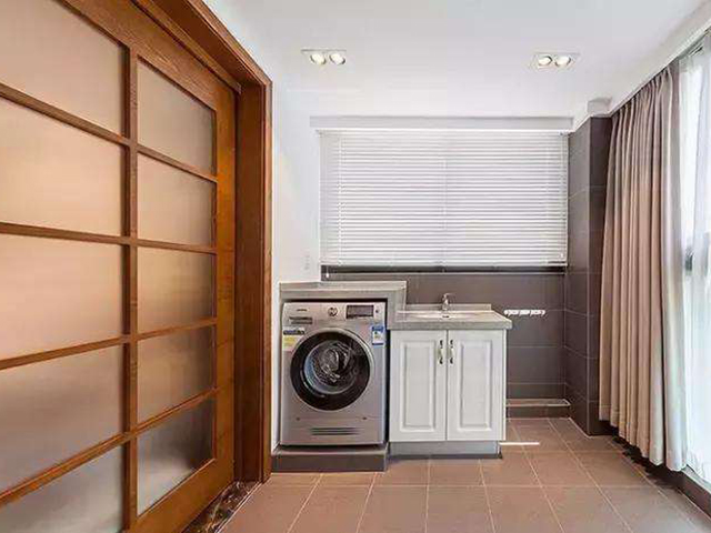 在洗衣機(jī)上方墻面安裝吊柜,也能增大陽(yáng)臺(tái)的收納空間,用來放雜物很合適。