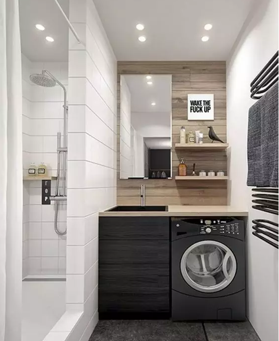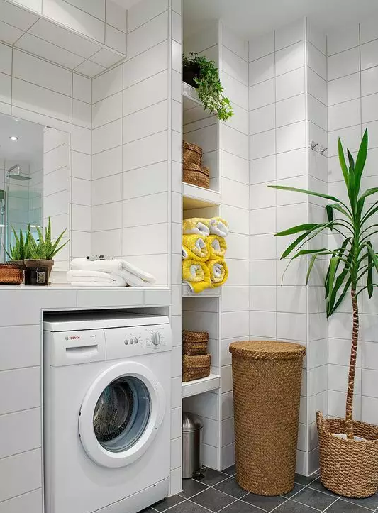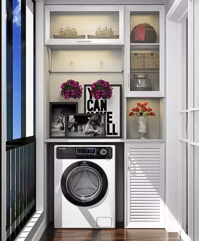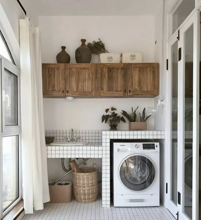 衛(wèi)生間面積不夠,或者覺得陽臺(tái)放洗衣機(jī)比較方便的小伙伴 ,也可以考慮把洗衣機(jī)放陽臺(tái),這樣洗完直接晾曬。