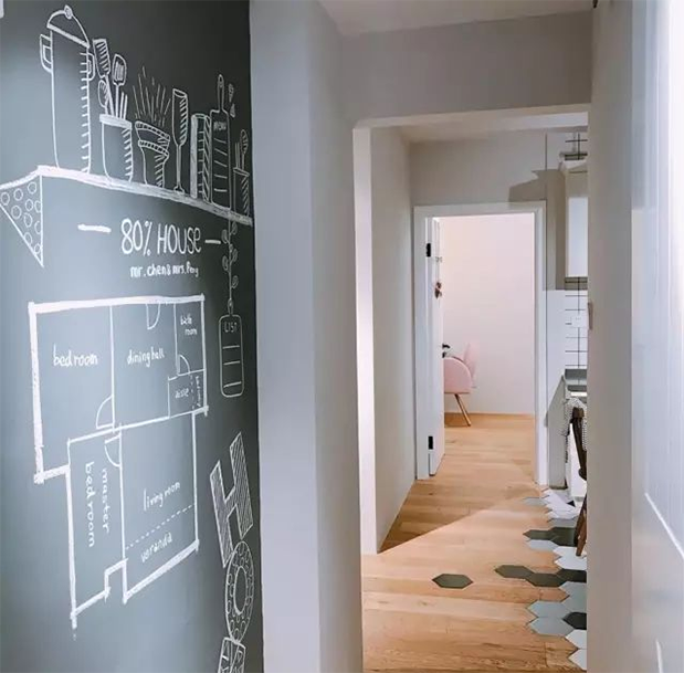 如果家里有小孩的情況,不妨把走廊的大白墻改成黑板墻,給小孩一個(gè)涂涂畫(huà)畫(huà)的小空間。有了黑板墻,再也不用擔(dān)心大白墻被涂花了。相比大白墻,黑板墻的裝飾效果充滿童趣。