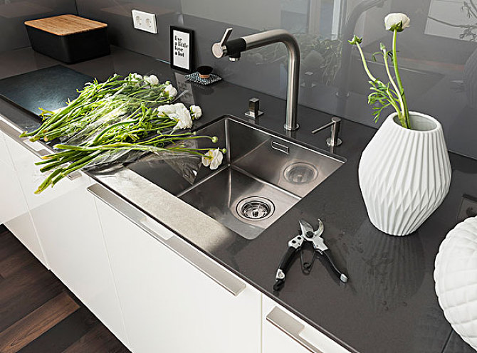 還有一個(gè)問(wèn)題:不銹鋼水槽最好選擇經(jīng)過(guò)拉絲處理的,這樣不會(huì)留下手印和水漬。如果不小心選了亮面的水槽,你會(huì)發(fā)現(xiàn),水漬留下的圈印兒是不管沖多少遍都沖不掉的,除非每天都用鋼絲球處理。