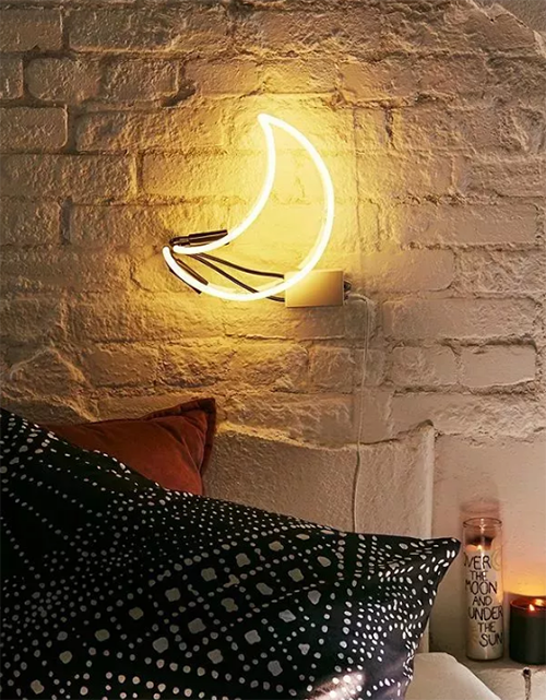 如果你對(duì)霓虹燈的印象還停留在酒吧和商業(yè)街,那端端可真是要?dú)獾椒籽哿?。造型多變的霓虹燈不僅能做臥室空間的氛圍照明,還能替代裝飾畫做床頭區(qū)的主要裝飾。