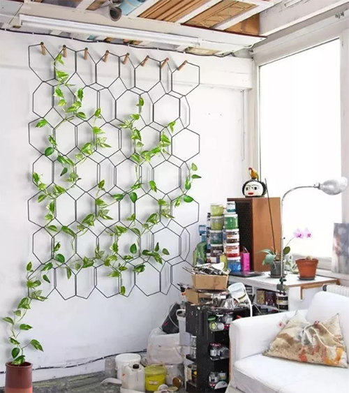 用金屬絲按規(guī)則或不規(guī)則的方式組合成一個(gè)整體,讓植物順著幾何架構(gòu)自然的延伸和生長(zhǎng),待它茂盛時(shí)你收獲的不僅是滿眼的綠色好風(fēng)景,更是清新怡人的好空氣。推薦植物:綠蘿。