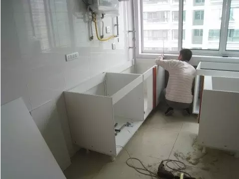 3、進行櫥柜、油煙機等炊具的安裝,水槽(上下水件稍后安裝)和煤氣灶也要跟上,記得通知物業(yè)開通煤氣測試一下。