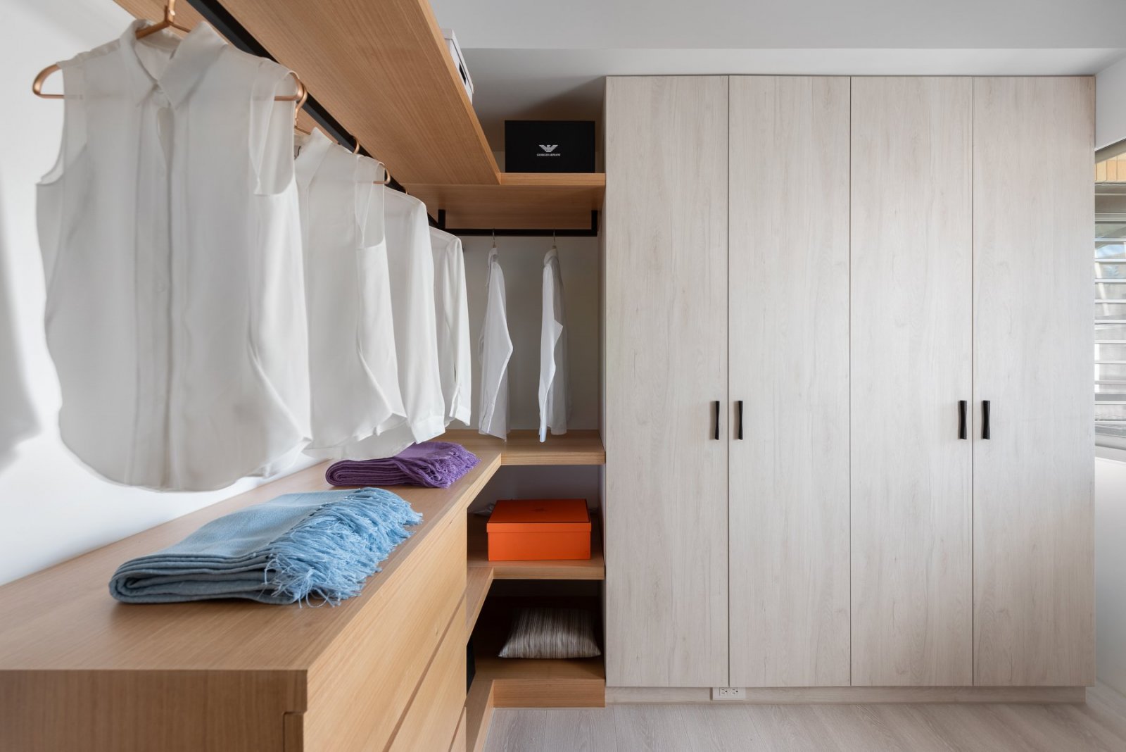 空間利用與使用比率一般有兩種,一種是建筑本身分割出來的,一種是通過自己或設(shè)計師,重新分割空間劃分出來的,實際上后者在空間上并不需要大,夠用就行。不常穿的衣物,不要占用空間,這是流動空間的優(yōu)化體現(xiàn)。