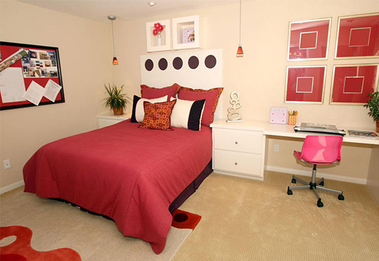 中國人認(rèn)為紅色是吉祥色,新婚的喜房就都是滿眼紅彤彤的。紅色還具有熱情、奔放的含義,充滿燃燒的力量。但居室內(nèi)紅色過多會讓眼睛負(fù)擔(dān)過重,產(chǎn)生頭暈?zāi)垦5母杏X,即使是新婚,也不能長時間讓房間處于紅色的主調(diào)下。建議選擇紅色在軟裝飾上使用,比如窗簾、床品、靠包等,而用淡淡的米色或清新的白色搭配,可以使人神清氣爽,更能突出紅色的喜慶氣氛。