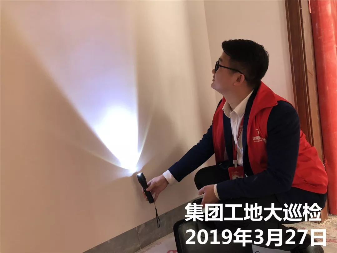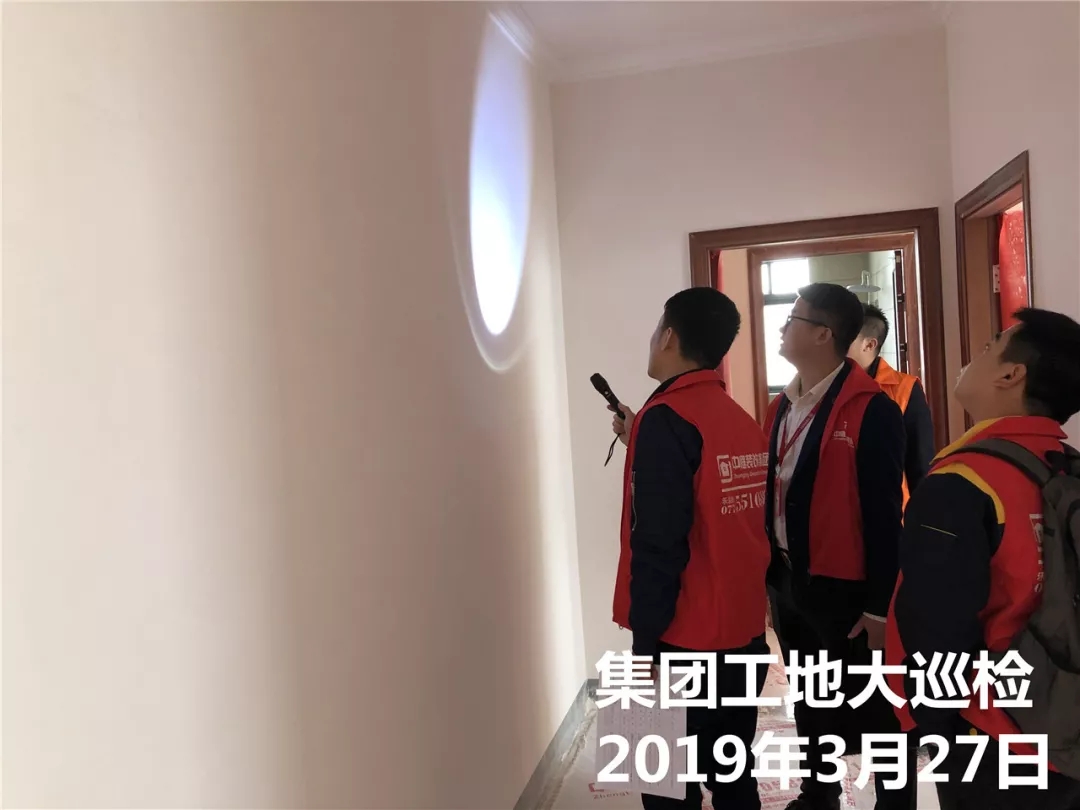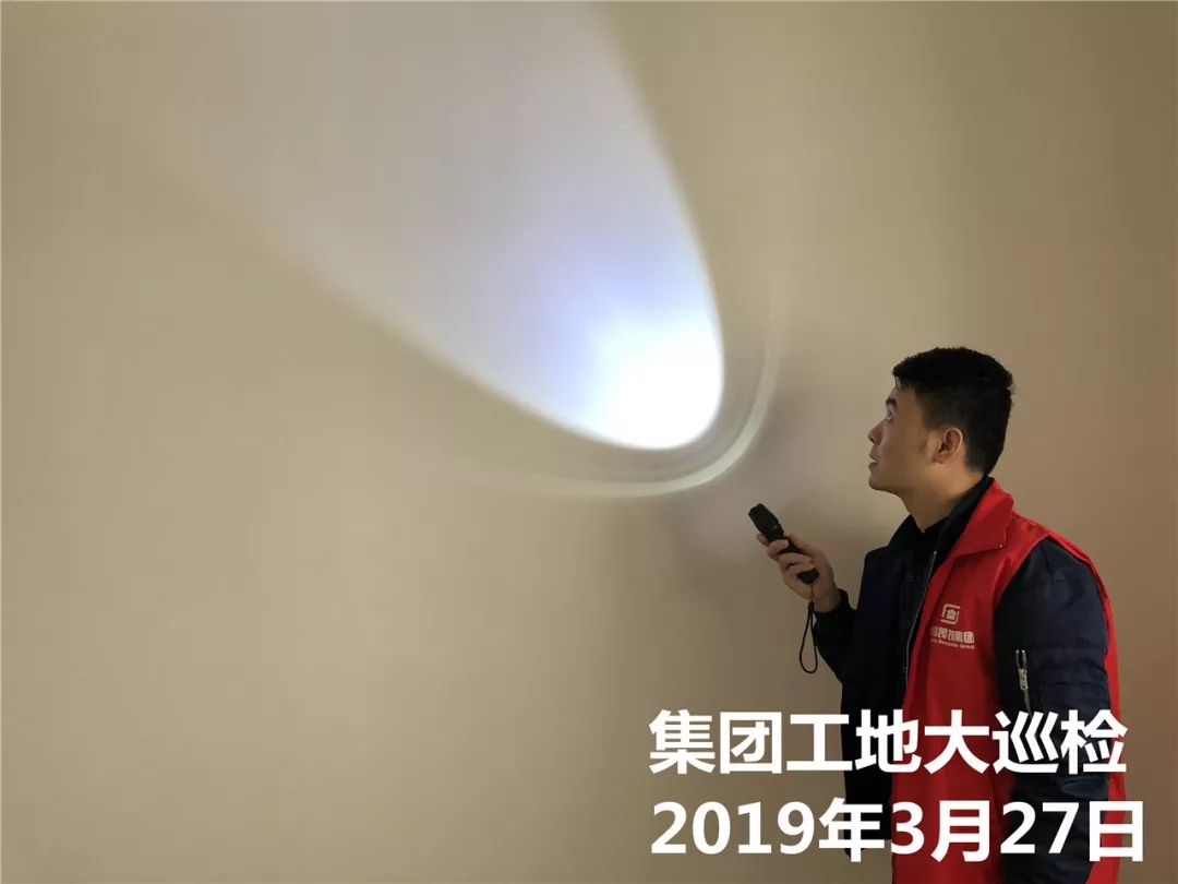 運(yùn)營(yíng)部成云總經(jīng)理與張立安總經(jīng)理用強(qiáng)光手電筒檢查墻面膩?zhàn)邮┕?/span>