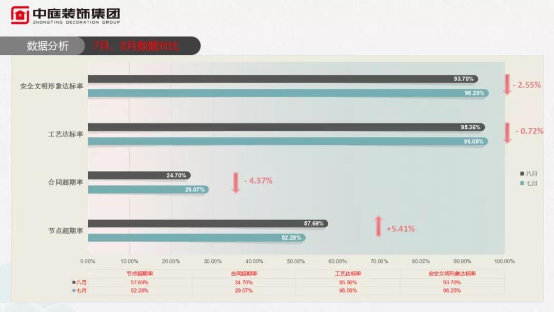 在總結(jié)8月份工作上,項(xiàng)目經(jīng)理個(gè)人月度達(dá)標(biāo)率和客服回訪業(yè)主評(píng)分成為衡量他們?cè)露裙ぷ鞯闹笜?biāo),每到這個(gè)環(huán)節(jié),大家的心都懸到了喉嚨眼,但凡工藝達(dá)標(biāo)率和安全文明形象達(dá)標(biāo)率沒有達(dá)到90%及以上的,都要上臺(tái)面向所有人承諾,下月勢(shì)必做好工地管理,雙向達(dá)標(biāo),否則按制度處罰!
