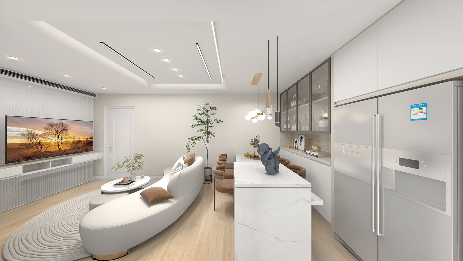 本案例為136㎡的現(xiàn)代簡約風格案例,大面積白色范圍的采用,使得空氣溫馨又大氣。簡潔的軟裝在流動的光影的輝映下,原本略顯清冷的空間,散發(fā)出隱奢的氣質(zhì)和高級感。