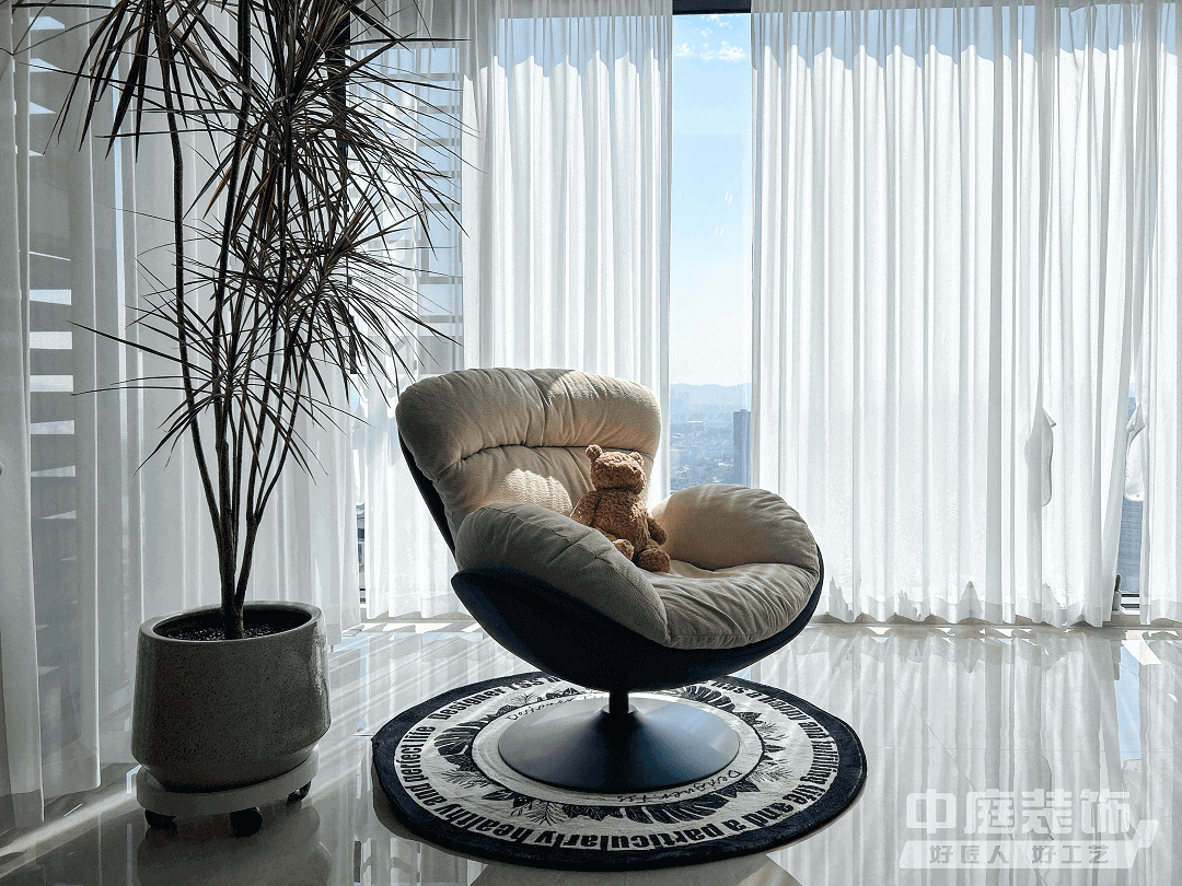 陽臺:為了不浪費(fèi)南面的湖景,規(guī)劃開放式陽臺,用以解決洗衣和收納雜物的問題,放上躺椅休息時直面一片風(fēng)景,身心舒暢。