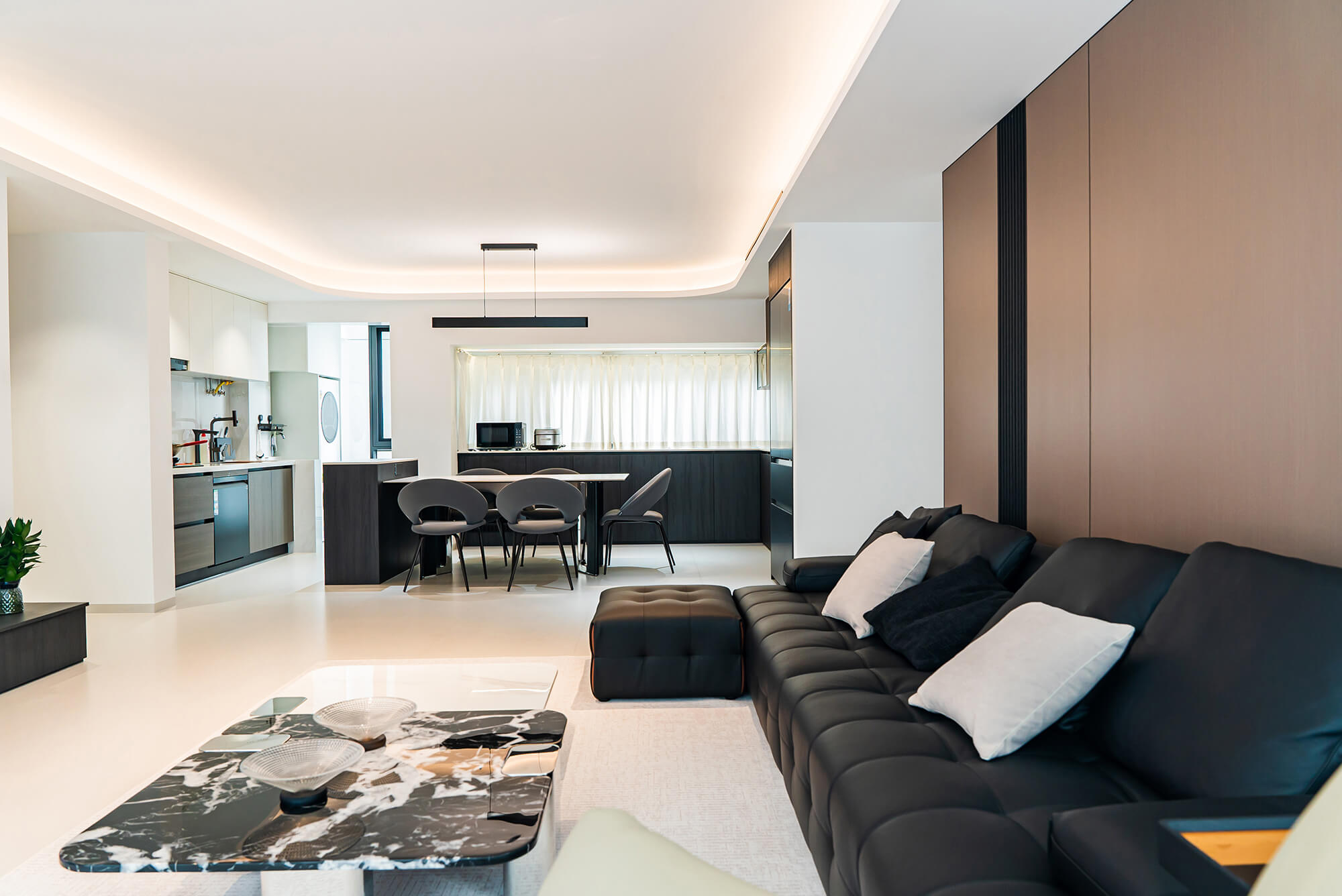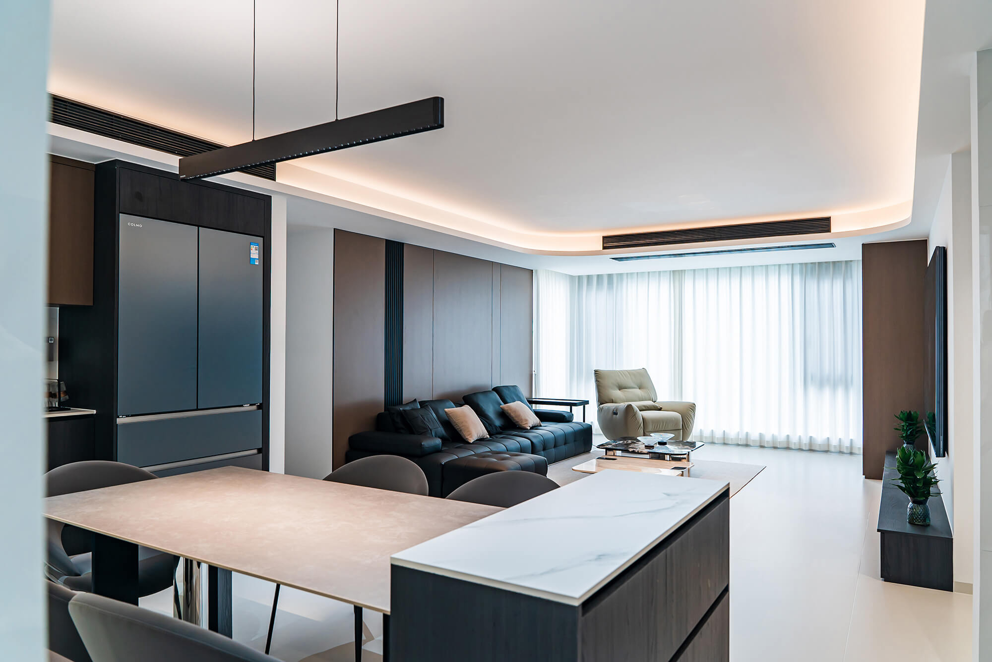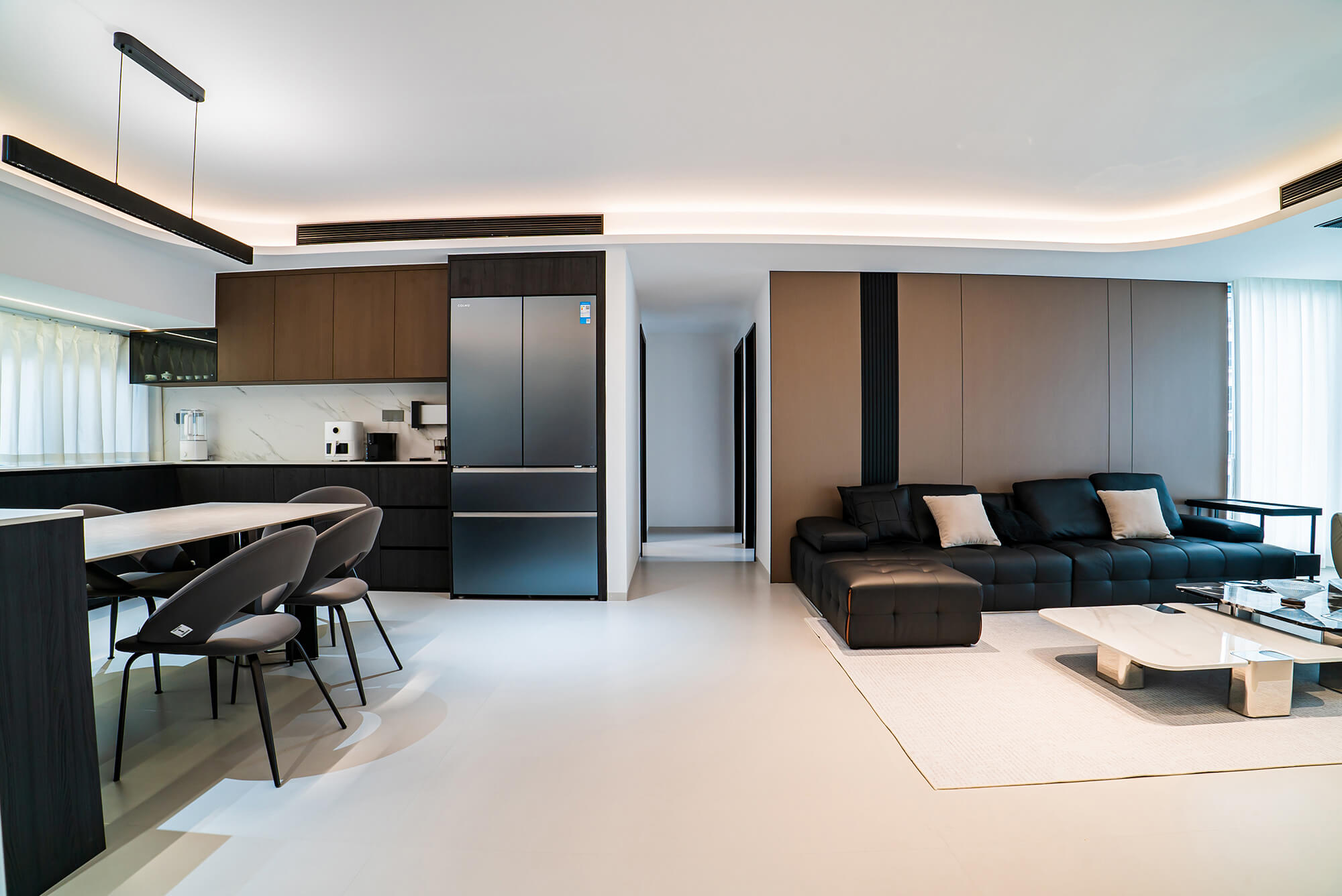 瀏覽量:217極致純粹的色彩美學,以黑、白、灰三個基礎(chǔ)色構(gòu)建空間骨架,通過不同明度、材質(zhì)的層次對比(如啞光水泥、亮面巖板、磨砂金屬)豐富視覺。線條利落干脆,無多余裝飾,注重功能與結(jié)構(gòu)的統(tǒng)一性,打造冷靜、理性、富有高級質(zhì)感的極簡空間。