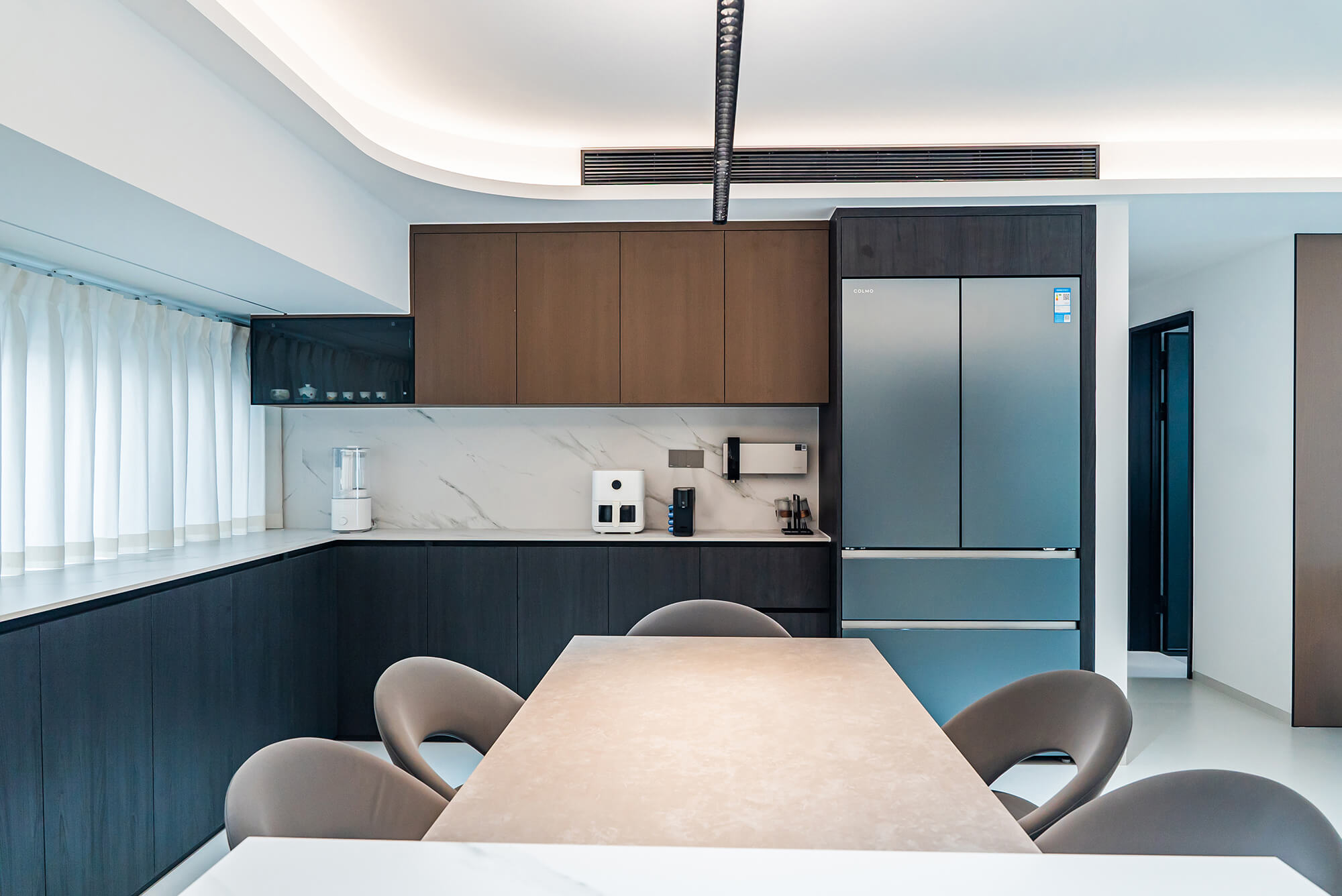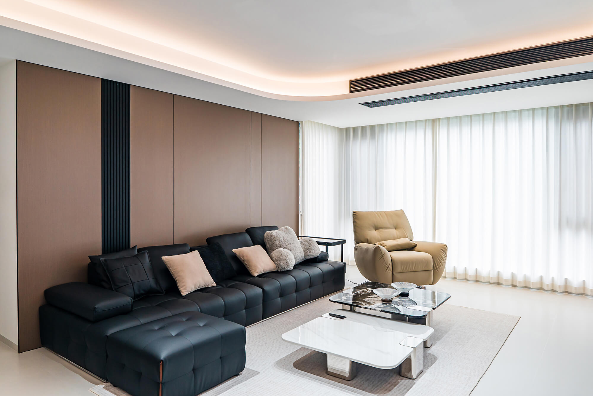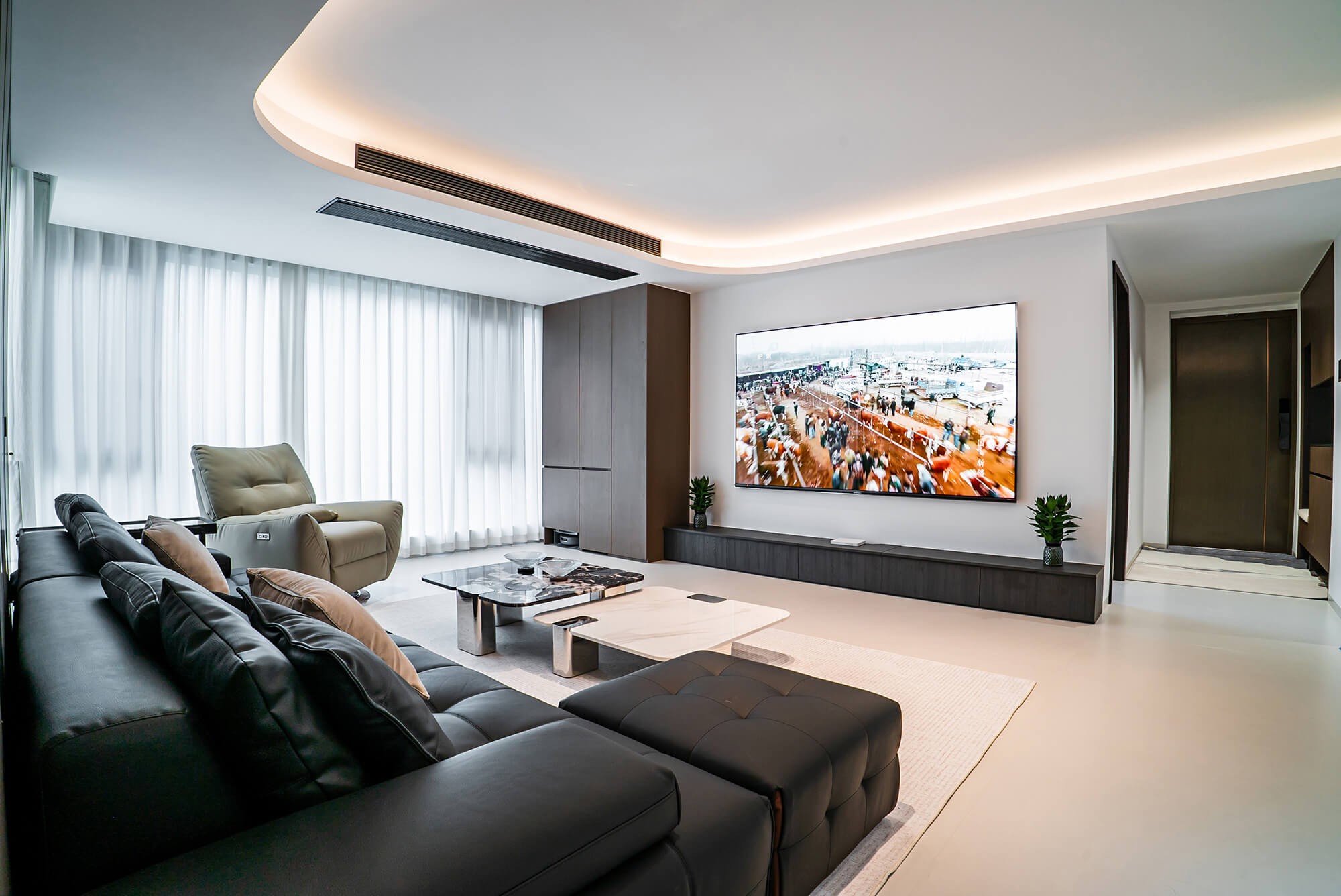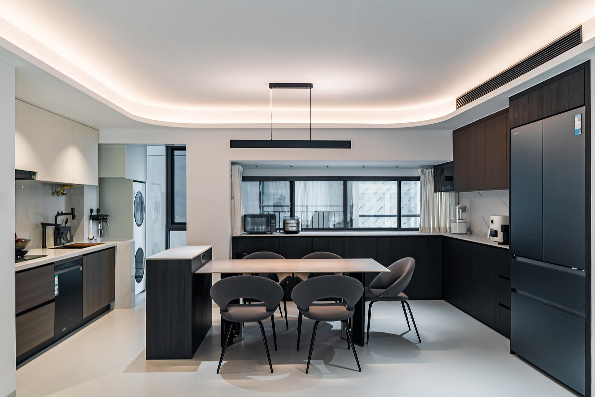 瀏覽量:217極致純粹的色彩美學,以黑、白、灰三個基礎(chǔ)色構(gòu)建空間骨架,通過不同明度、材質(zhì)的層次對比(如啞光水泥、亮面巖板、磨砂金屬)豐富視覺。線條利落干脆,無多余裝飾,注重功能與結(jié)構(gòu)的統(tǒng)一性,打造冷靜、理性、富有高級質(zhì)感的極簡空間。