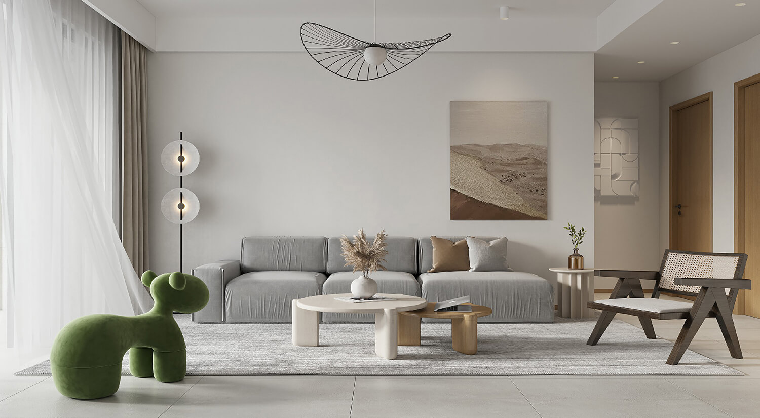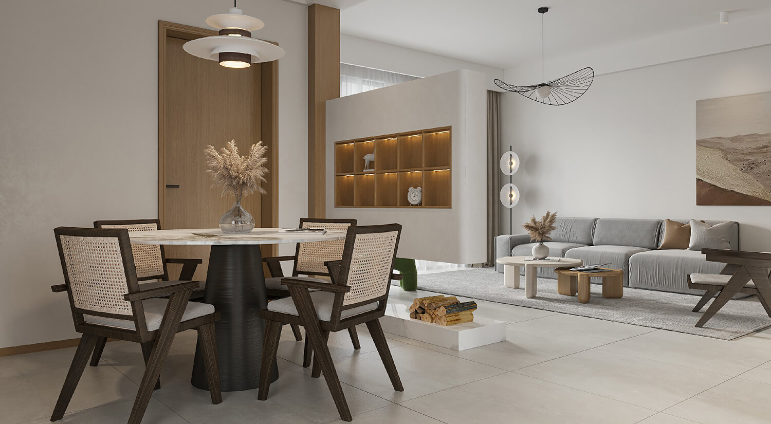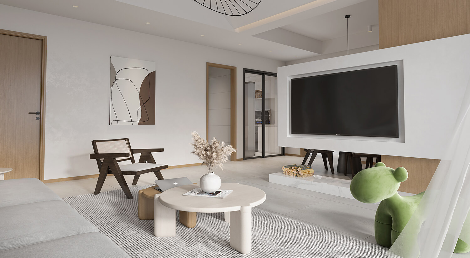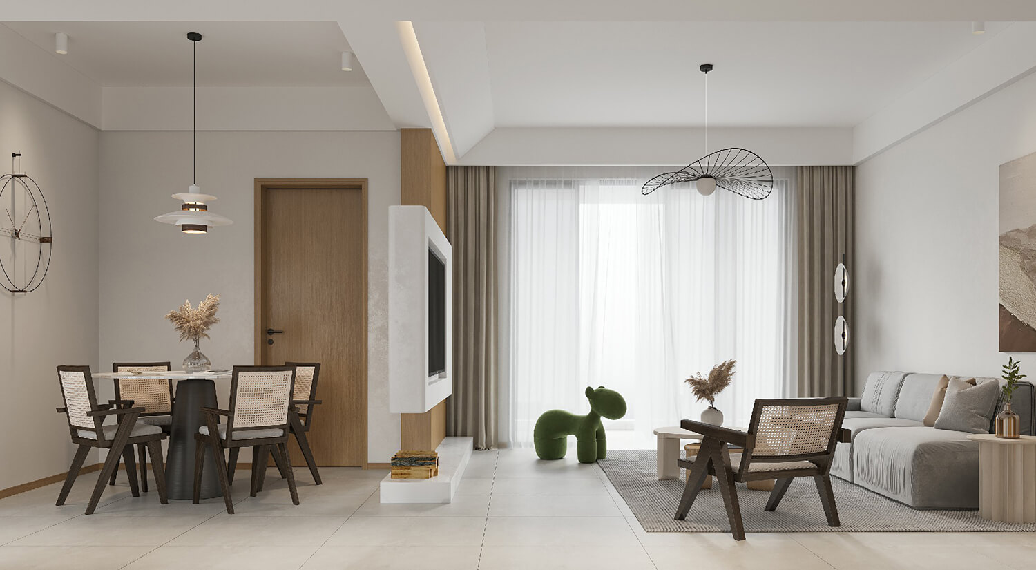 本案屬于現代簡約風格??蛷d采用無主燈設計,更具簡約時尚感。客餐廳布局合理,客餐廳通鋪淺灰色瓷磚。使空間更加開闊明亮,增加空間美觀度。