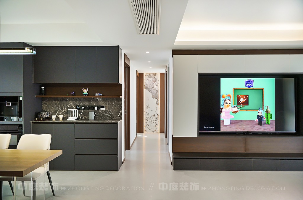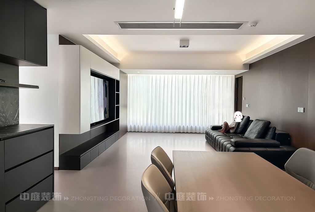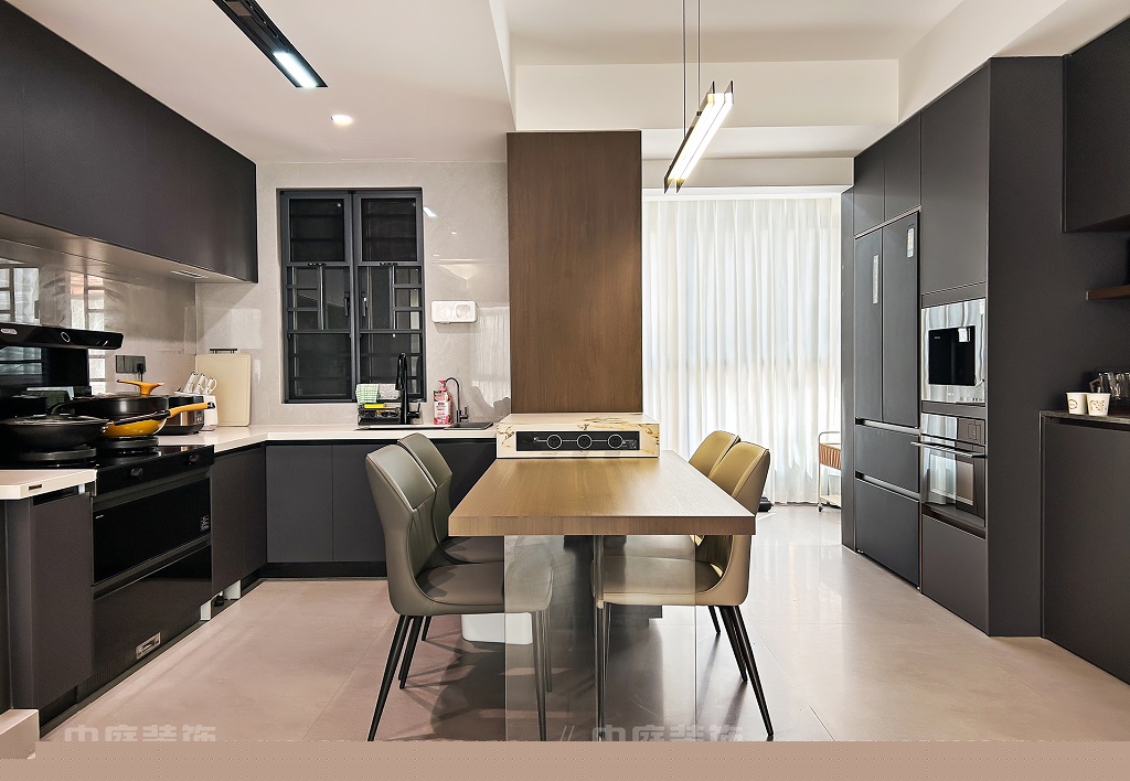 瀏覽量:37客廳以現(xiàn)代黑白灰極簡風格為核心,大面積白紗簾引入自然光線,黑色皮質(zhì)沙發(fā)質(zhì)感高級。開放式布局,深灰櫥柜與木質(zhì)餐桌形成材質(zhì)對比,線性吊燈提升精致感,功能與美學兼具,營造現(xiàn)代簡約的烹飪用餐氛圍。輕柔窗簾與柔和燈光,打造靜謐休息空間。精致的材質(zhì)選擇與合理的功能規(guī)劃,詮釋了“少即是多”的現(xiàn)代簡約居住美學。