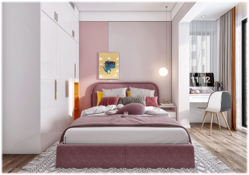 公主房主體以粉色輔以大面積留白,主體粉色吸引目光美麗溫馨,而充滿樂趣,大面積白色代表純潔,充分表現(xiàn)了少女的甜蜜純潔,在此之中輔以橙色在美麗中又不缺活潑,一點(diǎn)點(diǎn)灰色豐富整個(gè)畫面感帶有端莊,房間陽(yáng)臺(tái)外擴(kuò),充分利用空間開闊明亮。