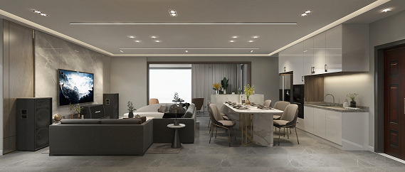 電視背景墻選用木飾面及巖板,質感柔和,地面用同色系深色些的瓷磚,讓空間更有層次感。